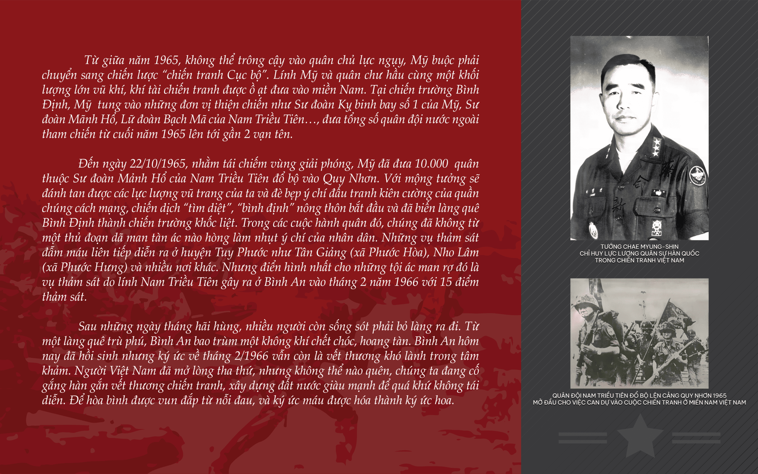 Đến ngày 22/10/1965, nhằm tái chiếm vùng giải phóng, Mỹ đã đưa 10.000 quân thuộc Sư đoàn Mãnh Hổ của Nam Triều Tiên đổ bộ vào Quy Nhơn. Với mộng tưởng sẽ đánh tan được các lực lượng vũ trang của ta và đè bẹp ý chí đấu tranh kiên cường của quần chúng cách mạng, chiến dịch “tìm diệt”, “bình định” nông thôn bắt đầu và đã biến làng quê Bình Định thành chiến trường khốc liệt. Trong các cuộc hành quân đó, chúng đã không từ một thủ đoạn dã man tàn ác nào hòng làm nhụt ý chí của nhân dân dân. Những vụ thảm sát đẫm máu liên tiếp diễn ra ở huyện Tuy Phước như Tân Giảng (xã Phước Hòa), Nho Lâm (xã Phước Hưng) và nhiều nơi khác. Nhưng điển hình nhất cho những tội ác man rợ đó là vụ thảm sát do lính Nam Triều Tiên gây ra ở Bình An vào tháng 2 năm 1966 với 15 điểm thảm sát.