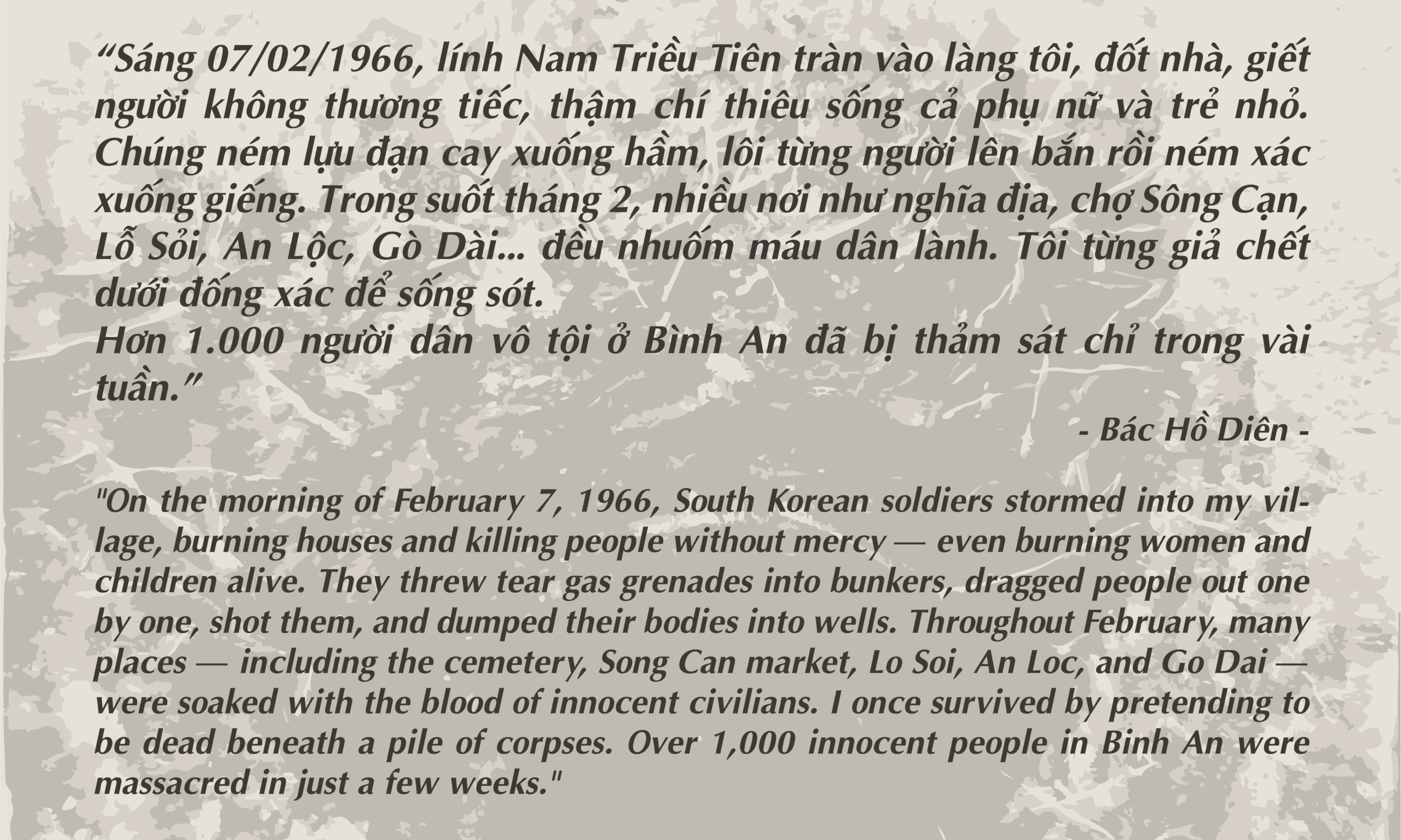 “Sáng 07/02/1966, lính Nam Triều Tiên tràn vào làng tôi, đốt nhà, giết người không thương tiếc, thậm chí thiêu sống cả phụ nữ và trẻ nhỏ. Chúng ném lựu đạn cay xuống hầm, lôi từng người lên bắn rồi ném xác xuống giếng. Trong suốt tháng 2, nhiều nơi như nghĩa địa, chợ Sông Cạn, Lỗ Sỏi, An Lộc, Gò Dài… đều nhuốm máu dân lành. Tôi từng giả chết dưới đống xác để sống sót.