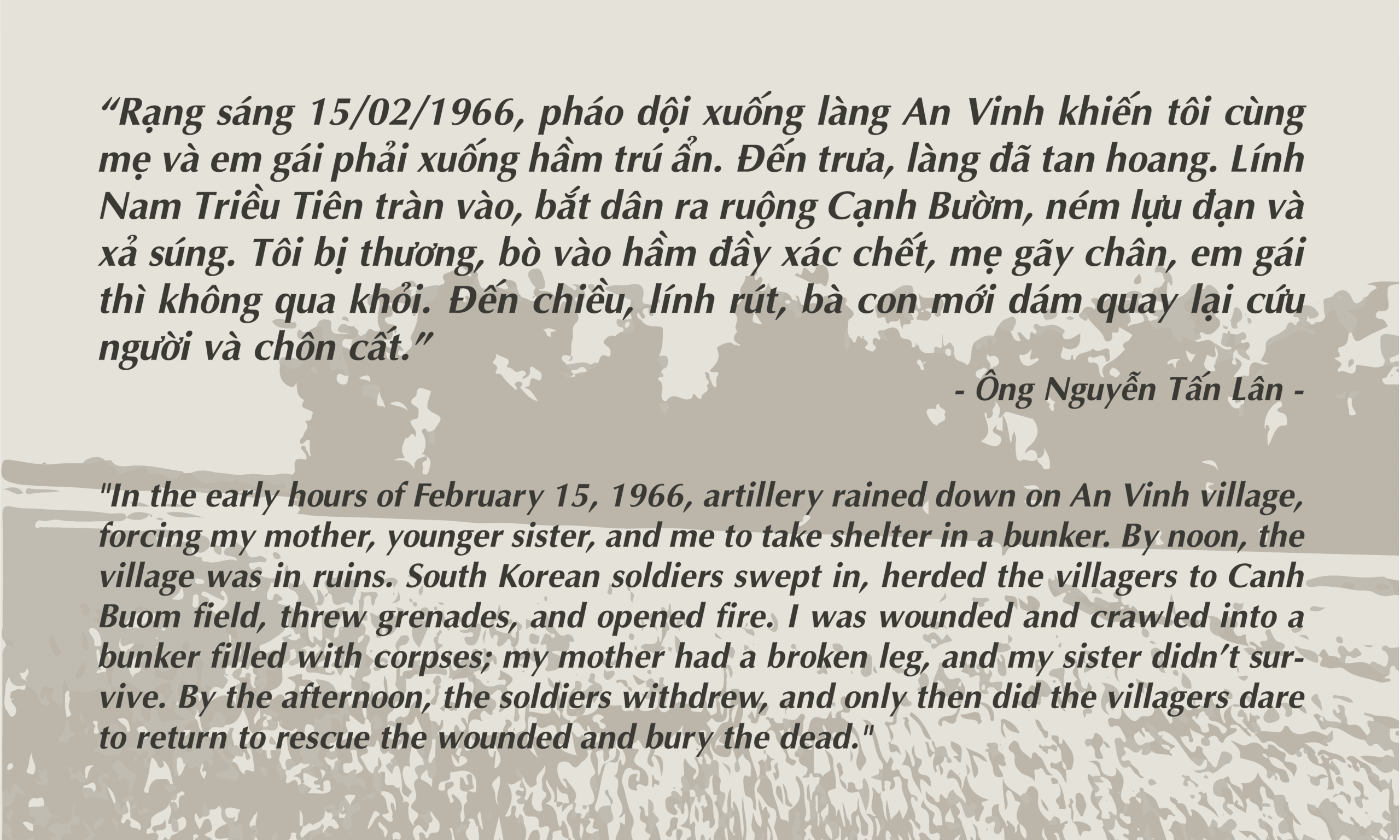 “Rạng sáng 15/02/1966, pháo dội xuống làng An Vinh khiến tôi cùng mẹ và em gái phải xuống hầm trú ẩn. Đến trưa, làng đã tan hoang. Lính Nam Triều Tiên tràn vào, bắt dân ra ruộng Cạnh Bướm, ném lựu đạn và xả súng. Tôi bị thương, bò vào hầm đầy xác chết, mẹ gãy chân, em gái thì không qua khỏi. Đến chiều, lính rút, bà con mới dám quay lại cứu người và chôn cất.”